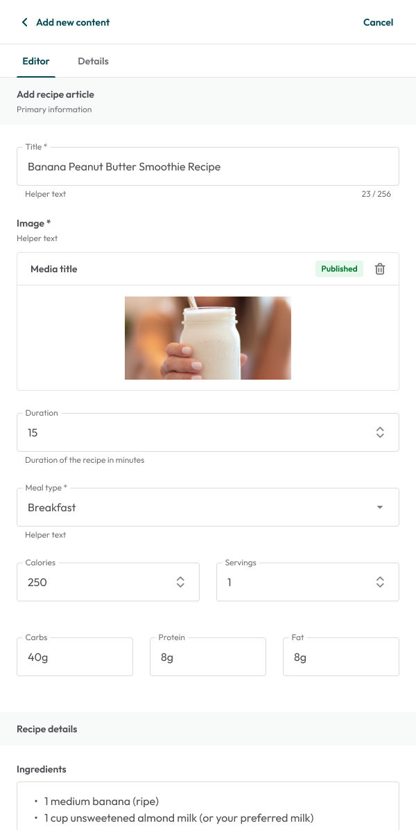 - Complete other form fields as required (e.g. duration, calories, servings, macronutrient breakdown, ingredients, directions, meal type, and nutrition information)